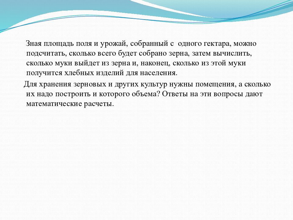 Зная площадь поля и урожай, собранный с одного гектара, можно подсчитать, сколько всего будет собрано зерна, затем вычислить, сколько муки выйдет из зерна и, наконец, сколько из этой муки получится хлебных изделий для населения. Для хранения зерновых и других культур нужны помещения, а сколько их надо построить и которого объема? Ответы на эти вопросы дают математические расчеты.