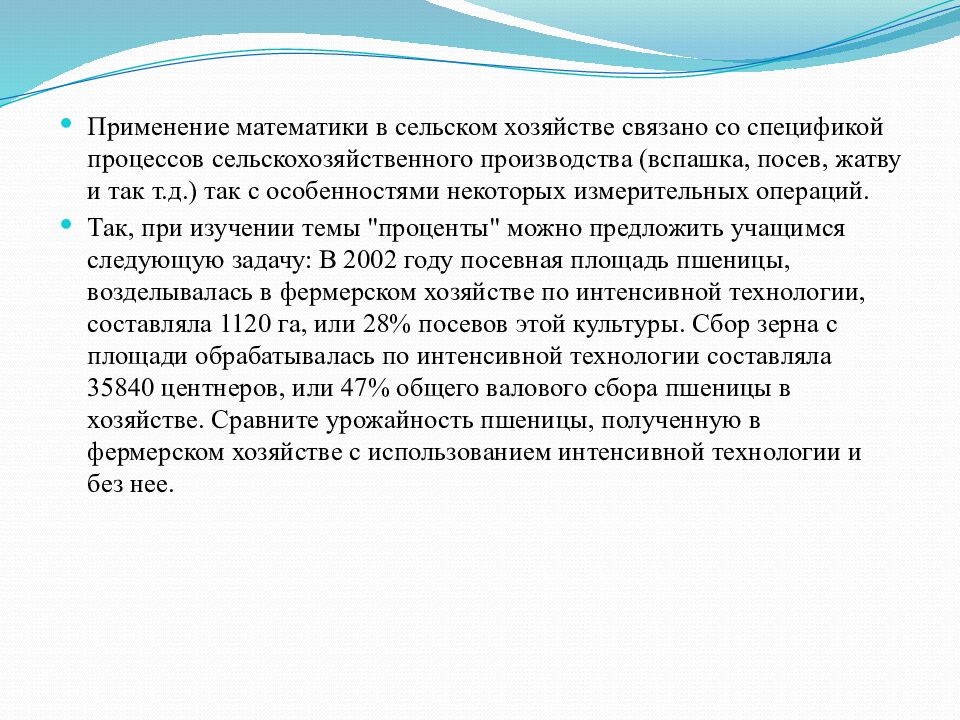 Применение математики в сельском хозяйстве связано со спецификой процессов сельскохозяйственного производства (вспашка, посев, жатву и так т.д.) так с особенностями некоторых измерительных операций. Так, при изучении темы "проценты" можно предложить учащимся следующую задачу: В 2002 году посевная площадь пшеницы, возделывалась в фермерском хозяйстве по интенсивной технологии, составляла 1120 га, или 28% посевов этой культуры. Сбор зерна с площади обрабатывалась по интенсивной технологии составляла 35840 центнеров, или 47% общего валового сбора пшеницы в хозяйстве. Сравните урожайность пшеницы, полученную в фермерском хозяйстве с использованием интенсивной технологии и без нее.
