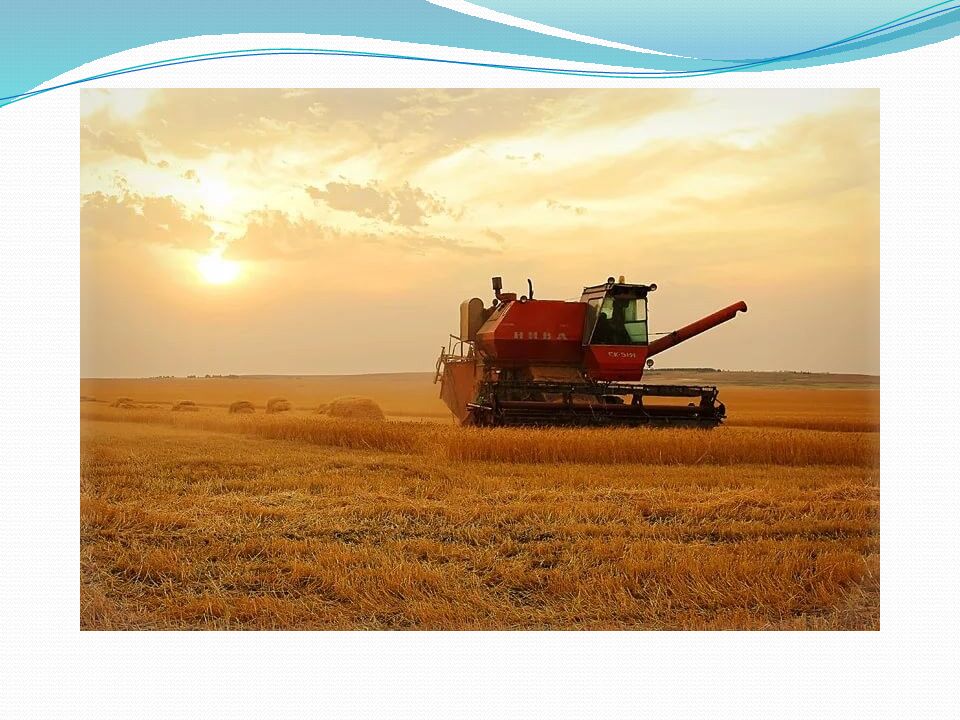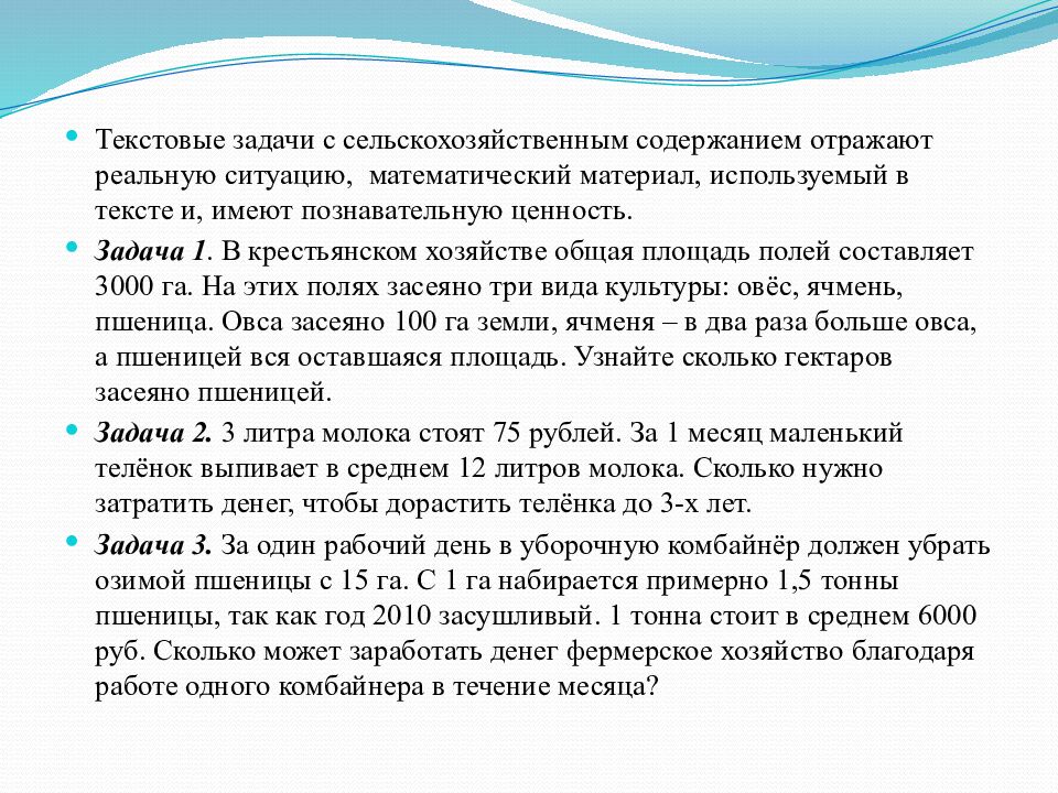 Текстовые задачи с сельскохозяйственным содержанием отражают реальную ситуацию, математический материал, используемый в тексте и, имеют познавательную ценность. Задача 1. В крестьянском хозяйстве общая площадь полей составляет 3000 га. На этих полях засеяно три вида культуры: овёс, ячмень, пшеница. Овса засеяно 100 га земли, ячменя – в два раза больше овса, а пшеницей вся оставшаяся площадь. Узнайте сколько гектаров засеяно пшеницей. Задача 2. 3 литра молока стоят 75 рублей. За 1 месяц маленький телёнок выпивает в среднем 12 литров молока. Сколько нужно затратить денег, чтобы дорастить телёнка до 3-х лет. Задача 3. За один рабочий день в уборочную комбайнёр должен убрать озимой пшеницы с 15 га. С 1 га набирается примерно 1,5 тонны пшеницы, так как год 2010 засушливый. 1 тонна стоит в среднем 6000 руб. Сколько может заработать денег фермерское хозяйство благодаря работе одного комбайнера в течение месяца?