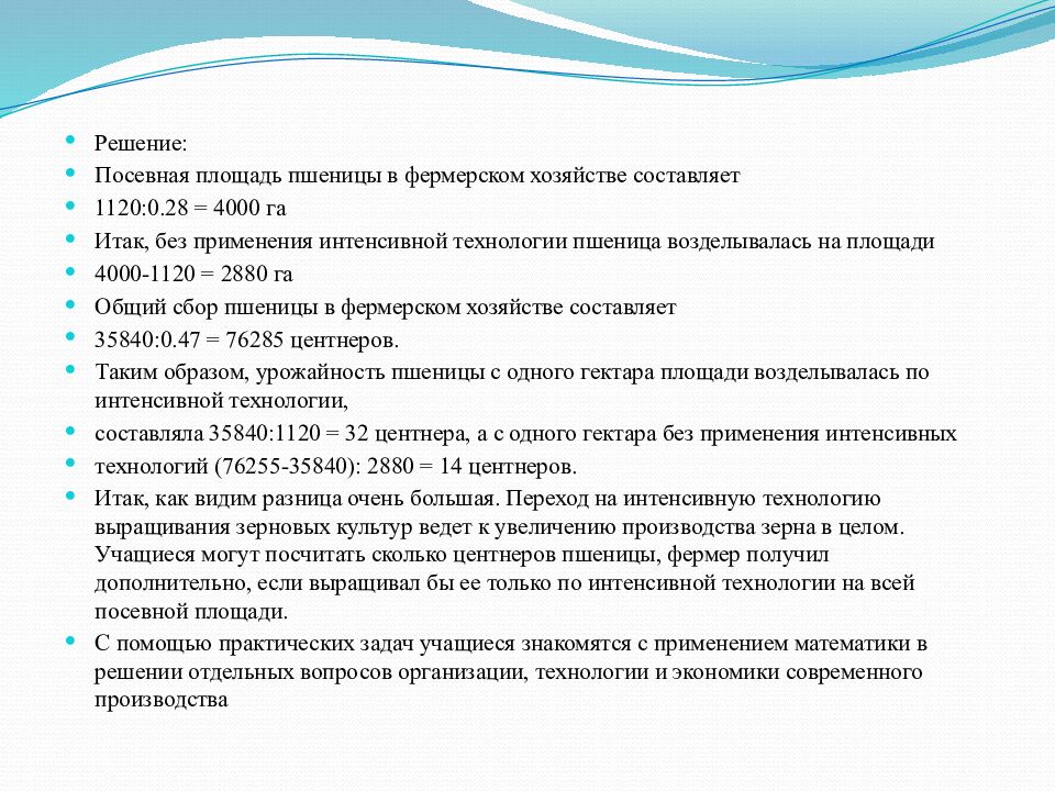 Решение: Посевная площадь пшеницы в фермерском хозяйстве составляет 1120:0.28 = 4000 га Итак, без применения интенсивной технологии пшеница возделывалась на площади 4000-1120 = 2880 га Общий сбор пшеницы в фермерском хозяйстве составляет 35840:0.47 = 76285 центнеров. Таким образом, урожайность пшеницы с одного гектара площади возделывалась по интенсивной технологии, составляла 35840:1120 = 32 центнера, а с одного гектара без применения интенсивных технологий (76255-35840): 2880 = 14 центнеров. Итак, как видим разница очень большая. Переход на интенсивную технологию выращивания зерновых культур ведет к увеличению производства зерна в целом. Учащиеся могут посчитать сколько центнеров пшеницы, фермер получил дополнительно, если выращивал бы ее только по интенсивной технологии на всей посевной площади. С помощью практических задач учащиеся знакомятся с применением математики в решении отдельных вопросов организации, технологии и экономики современного производства