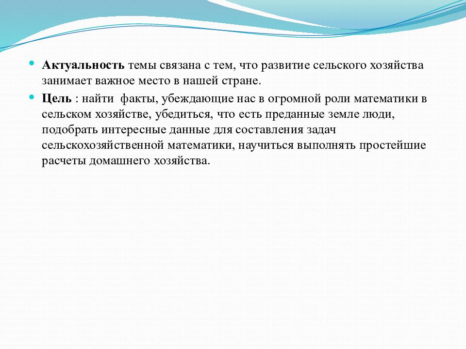Актуальность темы связана с тем, что развитие сельского хозяйства занимает важное место в нашей стране. Цель : найти факты, убеждающие нас в огромной роли математики в сельском хозяйстве, убедиться, что есть преданные земле люди, подобрать интересные данные для составления задач сельскохозяйственной математики, научиться выполнять простейшие расчеты домашнего хозяйства.