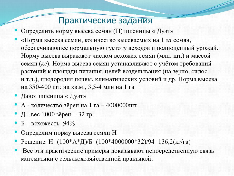 Определить норму высева семян (Н) пшеницы « Дуэт» «Норма высева семян, количество высеваемых на 1 га семян, обеспечивающее нормальную густоту всходов и полноценный урожай. Норму высева выражают числом всхожих семян (млн. шт.) и массой семян ( кг ). Норма высева семян устанавливают с учётом требований растений к площади питания, целей возделывания (на зерно, силос и т.д.), плодородия почвы, климатических условий и др. Норма высева на 350-400 шт. на кв.м., 3,5-4 млн на 1 га Дано: пшеница « Дуэт» А - количество зёрен на 1 га = 4000000шт. Д - вес 1000 зёрен = 32 гр. Б – всхожесть=94% Определим норму высева семян Н Решение: Н=(100*А*Д)/Б=(100*4000000*32)/94=136,2(кг/га) Все эти практические примеры доказывают непосредственную связь математики с сельскохозяйственной практикой.