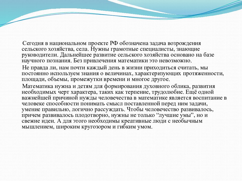 Сегодня в национальном проекте РФ обозначена задача возрождения сельского хозяйства, села. Нужны грамотные специалисты, знающие руководители. Дальнейшее развитие сельского хозяйства основано на базе научного познания. Без привлечения математики это невозможно. Не правда ли, нам почти каждый день в жизни приходиться считать, мы постоянно используем знания о величинах, характеризующих протяженности, площади, объемы, промежутки времени и многое другое. Математика нужна и детям для формирования духовного облика, развития необходимых черт характера, таких как терпение, трудолюбие. Ещё одной важнейшей причиной нужды человечества в математике является воспитание в человеке способности понимать смысл поставленной перед ним задачи, умение правильно, логично рассуждать. Чтобы человечество развивалось, причем развивалось плодотворно, нужны не только “лучшие умы”, но и свежие идеи. А для этого необходимы креативные люди с необычным мышлением, широким кругозором и гибким умом.