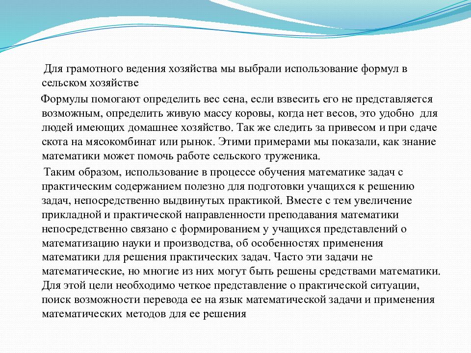 Для грамотного ведения хозяйства мы выбрали использование формул в сельском хозяйстве Формулы помогают определить вес сена, если взвесить его не представляется возможным, определить живую массу коровы, когда нет весов, это удобно для людей имеющих домашнее хозяйство. Так же следить за привесом и при сдаче скота на мясокомбинат или рынок. Этими примерами мы показали, как знание математики может помочь работе сельского труженика. Таким образом, использование в процессе обучения математике задач с практическим содержанием полезно для подготовки учащихся к решению задач, непосредственно выдвинутых практикой. Вместе с тем увеличение прикладной и практической направленности преподавания математики непосредственно связано с формированием у учащихся представлений о математизацию науки и производства, об особенностях применения математики для решения практических задач. Часто эти задачи не математические, но многие из них могут быть решены средствами математики. Для этой цели необходимо четкое представление о практической ситуации, поиск возможности перевода ее на язык математической задачи и применения математических методов для ее решения