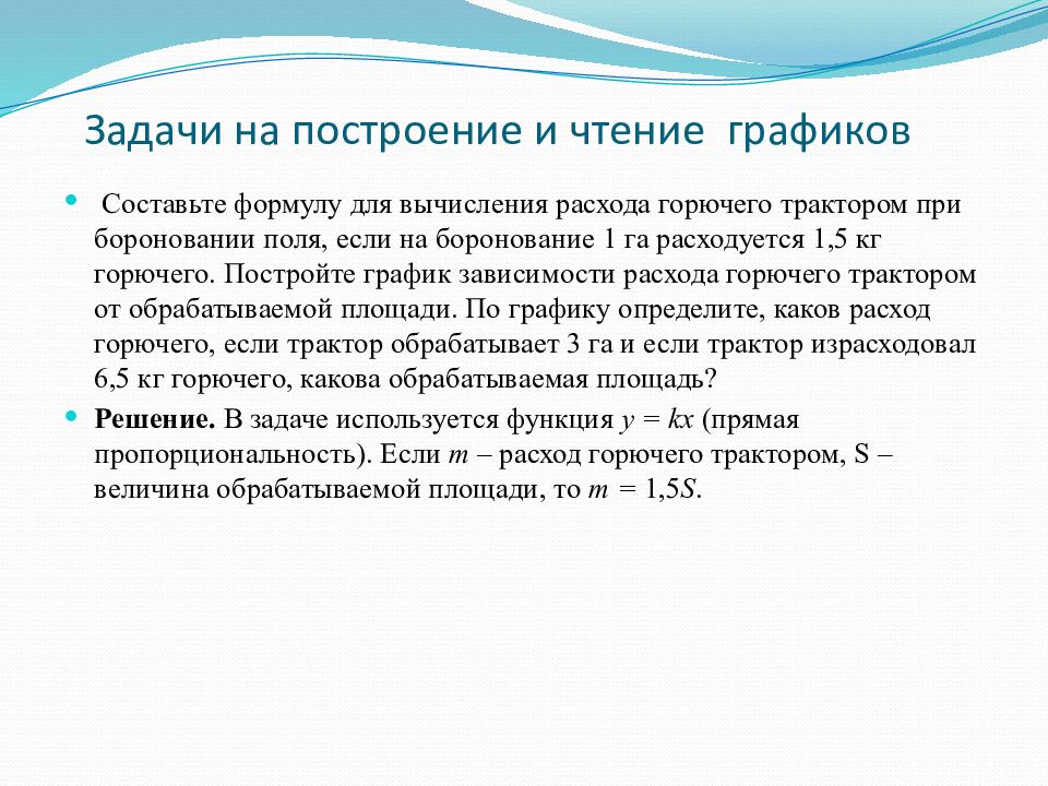 Составьте формулу для вычисления расхода горючего трактором при бороновании поля, если на боронование 1 га расходуется 1,5 кг горючего. Постройте график зависимости расхода горючего трактором от обрабатываемой площади. По графику определите, каков расход горючего, если трактор обрабатывает 3 га и если трактор израсходовал 6,5 кг горючего, какова обрабатываемая площадь? Решение. В задаче используется функция y = kx (прямая пропорциональность). Если m – расход горючего трактором, S – величина обрабатываемой площади, то m = 1,5 S.