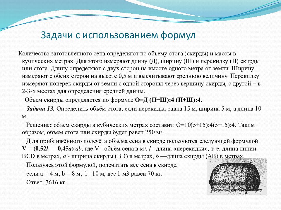 Количество заготовленного сена определяют по объему стога (скирды) и массы в кубических метрах. Для этого измеряют длину (Д), ширину (Ш) и перекидку (П) скирды или стога. Длину определяют с двух сторон на высоте одного метра от земли. Ширину измеряют с обеих сторон на высоте 0,5 м и высчитывают среднюю величину. Перекидку измеряют поперек скирды от земли с одной стороны через вершину скирды, с другой − в 2-3-х местах для определения средней длины. Объем скирды определяется по формуле О=Д (П+Ш):4 (П+Ш):4. Задача 13. Определить объём стога, если перекидка равна 15 м, ширина 5 м, а длина 10 м. Решение : объем скирды в кубических метрах составит: О=10(5+15):4(5+15):4. Таким образом, объем стога или скирды будет равен 250 м 3. Д ля приближённого подсчёта объёма сена в скирде пользуются следующей формулой: V = (0,52 l — 0,45 а ) ab, где V - объём сена в м 3, l - длина «перекидки», т. е. длина линии BCD в метрах, а - ширина скирды (ВD) в метрах, b —длина скирды (АВ) в метрах. Пользуясь этой формулой, подсчитать вес сена в скирде, если а = 4 м; b = 8 м; l =10 м; вес 1 м3 равен 70 кг. Ответ: 7616 кг