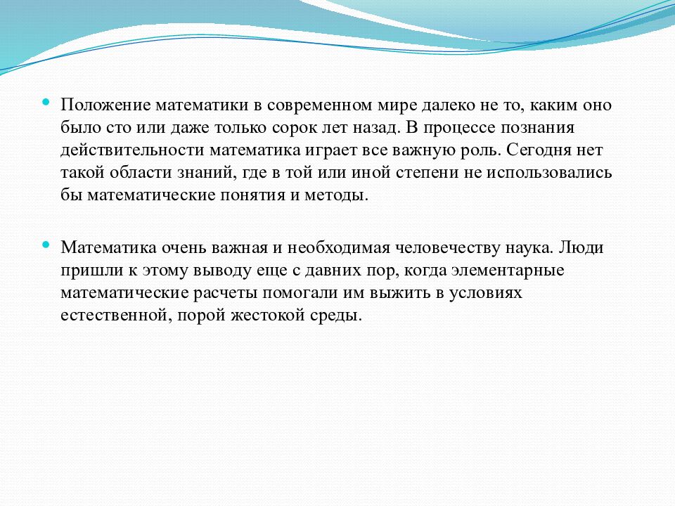 Положение математики в современном мире далеко не то, каким оно было сто или даже только сорок лет назад. В процессе познания действительности математика играет все важную роль. Сегодня нет такой области знаний, где в той или иной степени не использовались бы математические понятия и методы. Математика очень важная и необходимая человечеству наука. Люди пришли к этому выводу еще с давних пор, когда элементарные математические расчеты помогали им выжить в условиях естественной, порой жестокой среды.