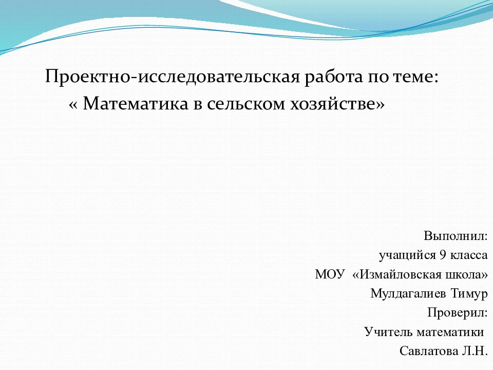 Проектно-исследовательская работа по теме: « Математика в сельском хозяйстве» Выполнил: учащийся 9 класса МОУ «Измайловская школа» Мулдагалиев Тимур Проверил: Учитель математики Савлатова Л.Н.