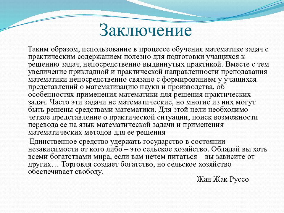 Таким образом, использование в процессе обучения математике задач с практическим содержанием полезно для подготовки учащихся к решению задач, непосредственно выдвинутых практикой. Вместе с тем увеличение прикладной и практической направленности преподавания математики непосредственно связано с формированием у учащихся представлений о математизацию науки и производства, об особенностях применения математики для решения практических задач. Часто эти задачи не математические, но многие из них могут быть решены средствами математики. Для этой цели необходимо четкое представление о практической ситуации, поиск возможности перевода ее на язык математической задачи и применения математических методов для ее решения Единственное средство удержать государство в состоянии независимости от кого либо – это сельское хозяйство. Обладай вы хоть всеми богатствами мира, если вам нечем питаться – вы зависите от других… Торговля создает богатство, но сельское хозяйство обеспечивает свободу. Жан Жак Руссо