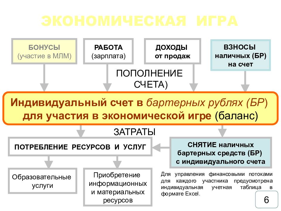 СНЯТИЕ наличных бартерных средств (БР) с индивидуального счета БОНУСЫ (участие в МЛМ) ДОХОДЫ от продаж РАБОТА (зарплата) ПОТРЕБЛЕНИЕ РЕСУРСОВ И УСЛУГ ЭКОНОМИЧЕСКАЯ ИГРА Индивидуальный счет в бартерных рублях (БР ) для участия в экономической игре (баланс) ЗАТРАТЫ ПОПОЛНЕНИЕ СЧЕТА) ВЗНОС Ы наличных (БР) на счет Образовательные услуги Приобретение информационных и материальных ресурсов Для управления финансовыми потоками для каждого участника предусмотрена индивидуальная учетная таблица в формате Excel. 6