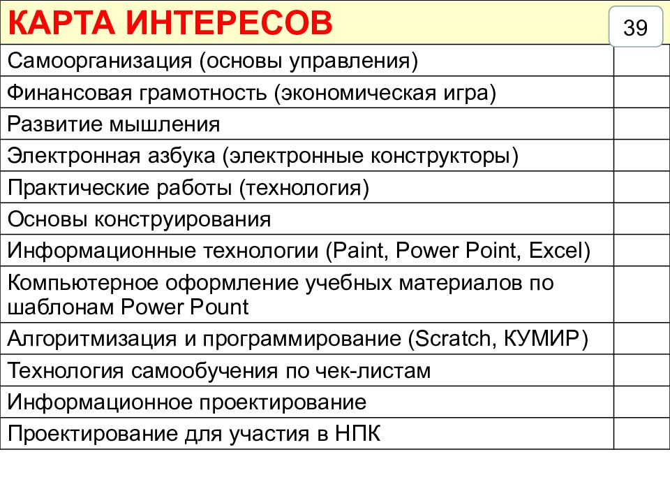 КАРТА ИНТЕРЕСОВ Самоорганизация (основы управления) Финансовая грамотность (экономическая игра) Развитие мышления Электронная азбука (электронные конструкторы) Практические работы (технология) Основы конструирования Информационные технологии ( Paint, Power Point, Excel) Компьютерное оформление учебных материалов по шаблонам Power Pount Алгоритмизация и программирование ( Scratch, КУМИР ) Технология самообучения по чек-листам Информационное проектирование Проектирование для участия в НПК 39