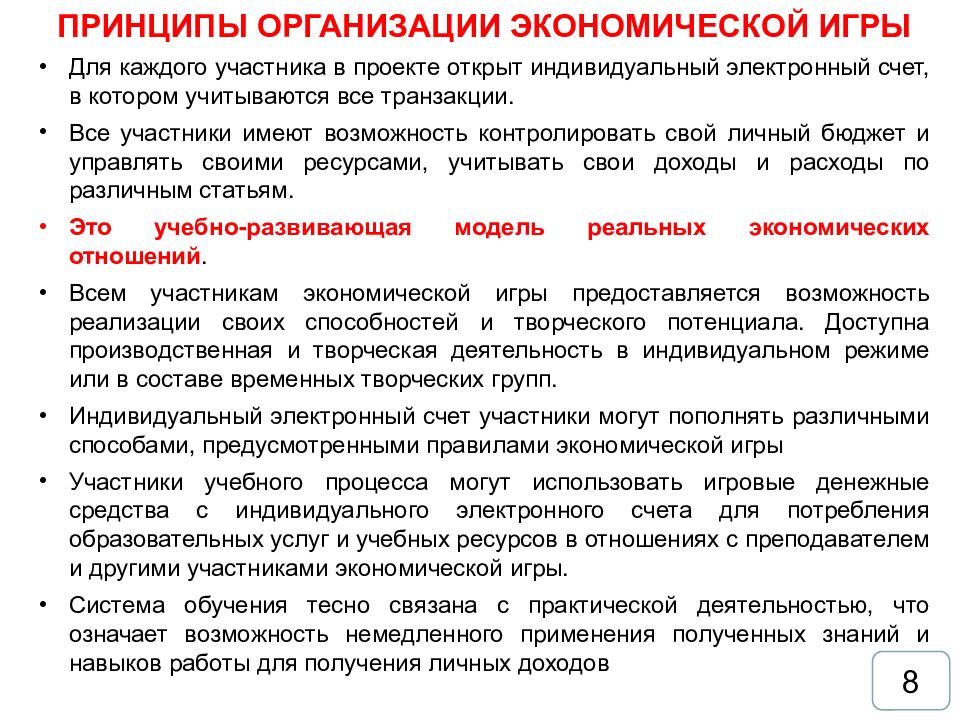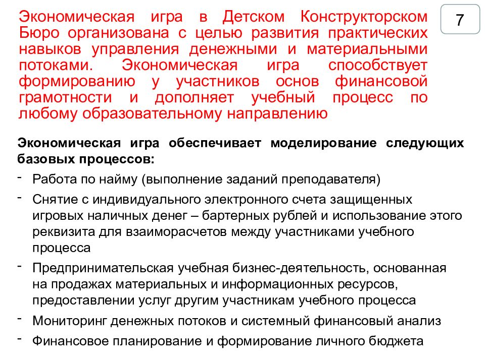 Экономическая игра обеспечивает моделирование следующих базовых процессов: Работа по найму (выполнение заданий преподавателя) Снятие с индивидуального электронного счета защищенных игровых наличных денег – бартерных рублей и использование этого реквизита для взаиморасчетов между участниками учебного процесса Предпринимательская учебная бизнес-деятельность, основанная на продажах материальных и информационных ресурсов, предоставлении услуг другим участникам учебного процесса Мониторинг денежных потоков и системный финансовый анализ Финансовое планирование и формирование личного бюджета 7 Экономическая игра в Детском Конструкторском Бюро организована с целью развития практических навыков управления денежными и материальными потоками. Экономическая игра способствует формированию у участников основ финансовой грамотности и дополняет учебный процесс по любому образовательному направлению