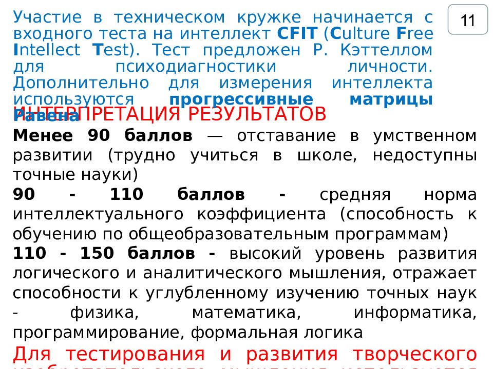 ИНТЕРПРЕТАЦИЯ РЕЗУЛЬТАТОВ Менее 90 баллов — отставание в умственном развитии (трудно учиться в школе, недоступны точные науки) 90 - 110 баллов - средняя норма интеллектуального коэффициента (способность к обучению по общеобразовательным программам) 110 - 150 баллов - высокий уровень развития логического и аналитического мышления, отражает способности к углубленному изучению точных наук - физика, математика, информатика, программирование, формальная логика Для тестирования и развития творческого изобретательского мышления используется пакет компьютерных программ ЗАРАБОТАЛО. 11 Участие в техническом кружке начинается с входного теста на интеллект CFIT ( C ulture F ree I ntellect T est ). Тест предложен Р. Кэттеллом для психодиагностики личности. Дополнительно для измерения интеллекта используются прогрессивные матрицы Равена