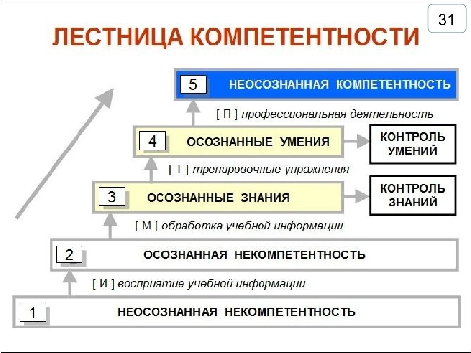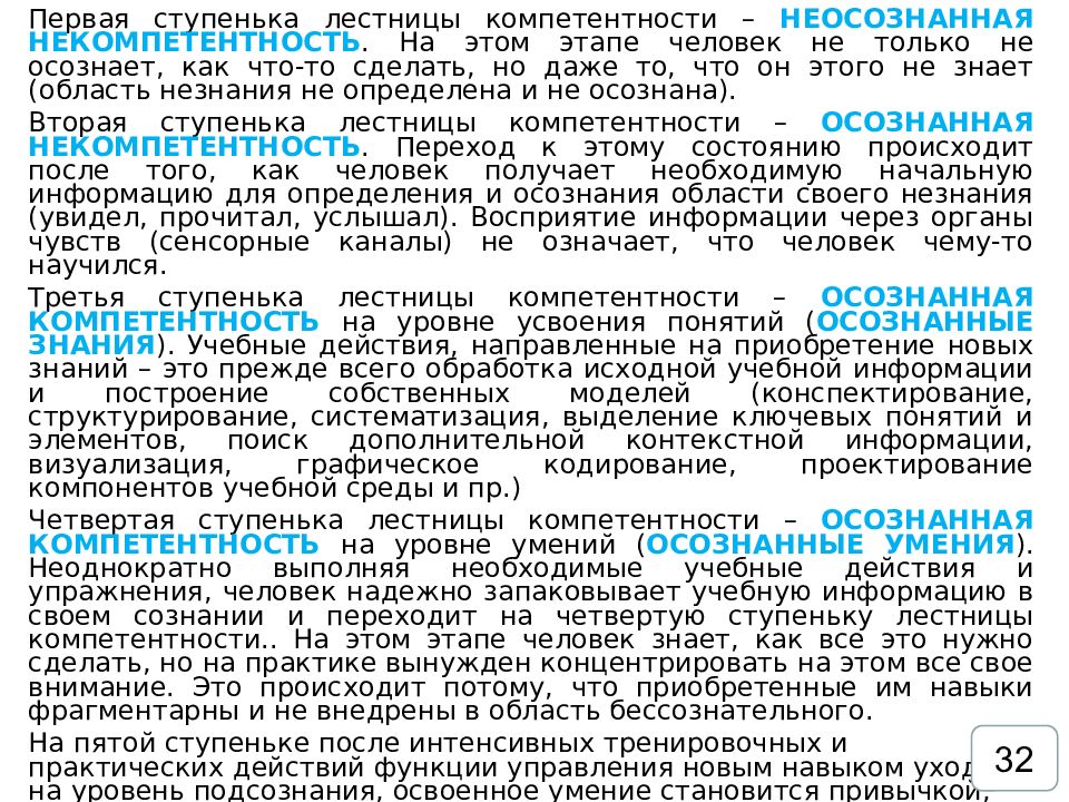 Первая ступенька лестницы компетентности – НЕОСОЗНАННАЯ НЕКОМПЕТЕНТНОСТЬ. На этом этапе человек не только не осознает, как что-то сделать, но даже то, что он этого не знает (область незнания не определена и не осознана). Вторая ступенька лестницы компетентности – ОСОЗНАННАЯ НЕКОМПЕТЕНТНОСТЬ. Переход к этому состоянию происходит после того, как человек получает необходимую начальную информацию для определения и осознания области своего незнания (увидел, прочитал, услышал). Восприятие информации через органы чувств (сенсорные каналы) не означает, что человек чему-то научился. Третья ступенька лестницы компетентности – ОСОЗНАННАЯ КОМПЕТЕНТНОСТЬ на уровне усвоения понятий ( ОСОЗНАННЫЕ ЗНАНИЯ ). Учебные действия, направленные на приобретение новых знаний – это прежде всего обработка исходной учебной информации и построение собственных моделей (конспектирование, структурирование, систематизация, выделение ключевых понятий и элементов, поиск дополнительной контекстной информации, визуализация, графическое кодирование, проектирование компонентов учебной среды и пр.) Четвертая ступенька лестницы компетентности – ОСОЗНАННАЯ КОМПЕТЕНТНОСТЬ на уровне умений ( ОСОЗНАННЫЕ УМЕНИЯ ). Неоднократно выполняя необходимые учебные действия и упражнения, человек надежно запаковывает учебную информацию в своем сознании и переходит на четвертую ступеньку лестницы компетентности.. На этом этапе человек знает, как все это нужно сделать, но на практике вынужден концентрировать на этом все свое внимание. Это происходит потому, что приобретенные им навыки фрагментарны и не внедрены в область бессознательного. На пятой ступеньке после интенсивных тренировочных и практических действий функции управления новым навыком уходят на уровень подсознания, освоенное умение становится привычкой, рефлексом (паттерном) и применяется человеком автоматически (на автопилоте), освободив наше внимание и оперативную память для восприятия новой информации. Эта ступенька лестницы компетентности называется – НЕОСОЗНАННАЯ КОМПЕТЕНТНОСТЬ и определяет уровень бессознательных автоматических навыков, необходимых для успешной профессиональной деятельности. 32