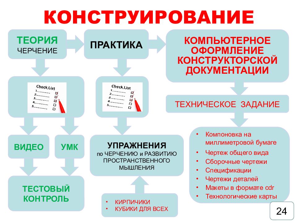 КОНСТРУИРОВАНИЕ ТЕОРИЯ ЧЕРЧЕНИЕ ПРАКТИКА КОМПЬЮТЕРНОЕ ОФОРМЛЕНИЕ КОНСТРУКТОРСКОЙ ДОКУМЕНТАЦИИ ВИДЕО УМК ТЕСТОВЫЙ КОНТРОЛЬ УПРАЖНЕНИЯ по ЧЕРЧЕНИЮ и РАЗВИТИЮ ПРОСТРАНСТВЕННОГО МЫШЛЕНИЯ ТЕХНИЧЕСКОЕ ЗАДАНИЕ Компоновка на миллиметровой бумаге Чертеж общего вида Сборочные чертежи Спецификации Чертежи деталей Макеты в формате cdr Технологические карты КИРПИЧИКИ КУБИКИ ДЛЯ ВСЕХ 24