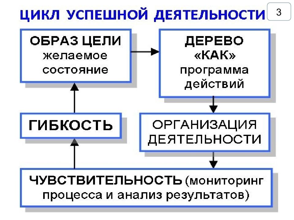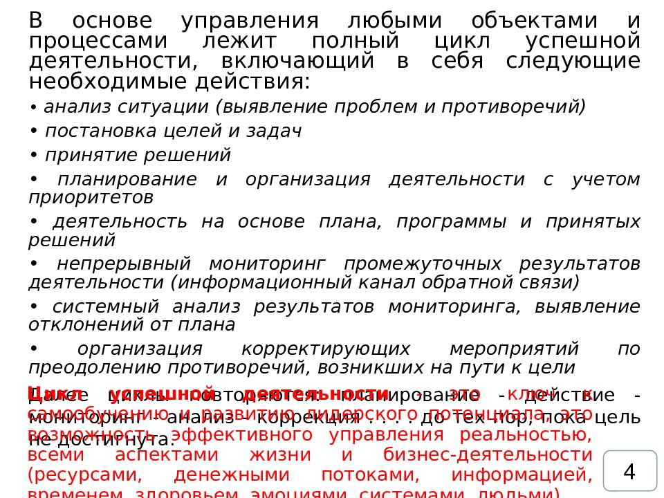 В основе управления любыми объектами и процессами лежит полный цикл успешной деятельности, включающий в себя следующие необходимые действия: • анализ ситуации (выявление проблем и противоречий) • постановка целей и задач • принятие решений • планирование и организация деятельности с учетом приоритетов • деятельность на основе плана, программы и принятых решений • непрерывный мониторинг промежуточных результатов деятельности (информационный канал обратной связи) • системный анализ результатов мониторинга, выявление отклонений от плана • организация корректирующих мероприятий по преодолению противоречий, возникших на пути к цели Далее циклы повторяются: планирование - действие - мониторинг - анализ - коррекция.... до тех пор, пока цель не достигнута. 4 Цикл успешной деятельности - это ключ к самообучению и развитию лидерского потенциала, это возможность эффективного управления реальностью, всеми аспектами жизни и бизнес-деятельности (ресурсами, денежными потоками, информацией, временем, здоровьем, эмоциями, системами, людьми).