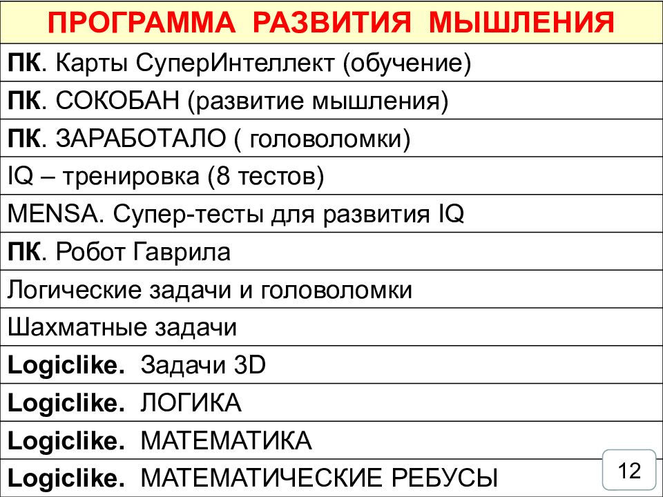 ПРОГРАММА РАЗВИТИЯ МЫШЛЕНИЯ ПК. Карты СуперИнтеллект (обучение) ПК. СОКОБАН (развитие мышления) ПК. ЗАРАБОТАЛО ( головоломки) IQ – тренировка (8 тестов) MENSA. Супер-тесты для развития IQ ПК. Робот Гаврила Логические задачи и головоломки Шахматные задачи Logiclike. Задачи 3D Logiclike. ЛОГИКА Logiclike. МАТЕМАТИКА Logiclike. МАТЕМАТИЧЕСКИЕ РЕБУСЫ 12