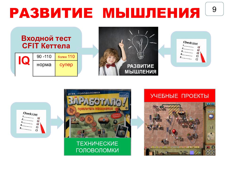 РАЗВИТИЕ МЫШЛЕНИЯ Входной тест CFIT Кеттела IQ 90 -110 более 110 норма супер РАЗВИТИЕ МЫШЛЕНИЯ УЧЕБНЫЕ ПРОЕКТЫ ТЕХНИЧЕСКИЕ ГОЛОВОЛОМКИ 9