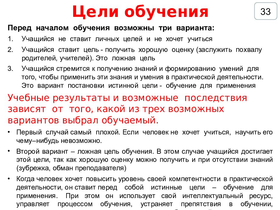 Цели обучения Перед началом обучения возможны три варианта: Учащийся не ставит личных целей и не хочет учиться Учащийся ставит цель - получить хорошую оценку (заслужить похвалу родителей, учителей). Это ложная цель Учащийся стремится к получению знаний и формированию умений для того, чтобы применить эти знания и умения в практической деятельности. Это вариант постановки истинной цели - обучение для применения Учебные результаты и возможные последствия зависят от того, какой из трех возможных вариантов выбрал обучаемый. Первый случай самый плохой. Если человек не хочет учиться, научить его чему–нибудь невозможно. Второй вариант – ложная цель обучения. В этом случае учащийся достигает этой цели, так как хорошую оценку можно получить и при отсутствии знаний (зубрежка, обман преподавателя) Когда человек хочет повысить уровень своей компетентности в практической деятельности, он ставит перед собой истинные цели – обучение для применения. При этом он использует свой интеллектуальный ресурс, управляет процессом обучения, устраняет препятствия в обучении, сотрудничает с преподавателем и достигает учебных целей. 33
