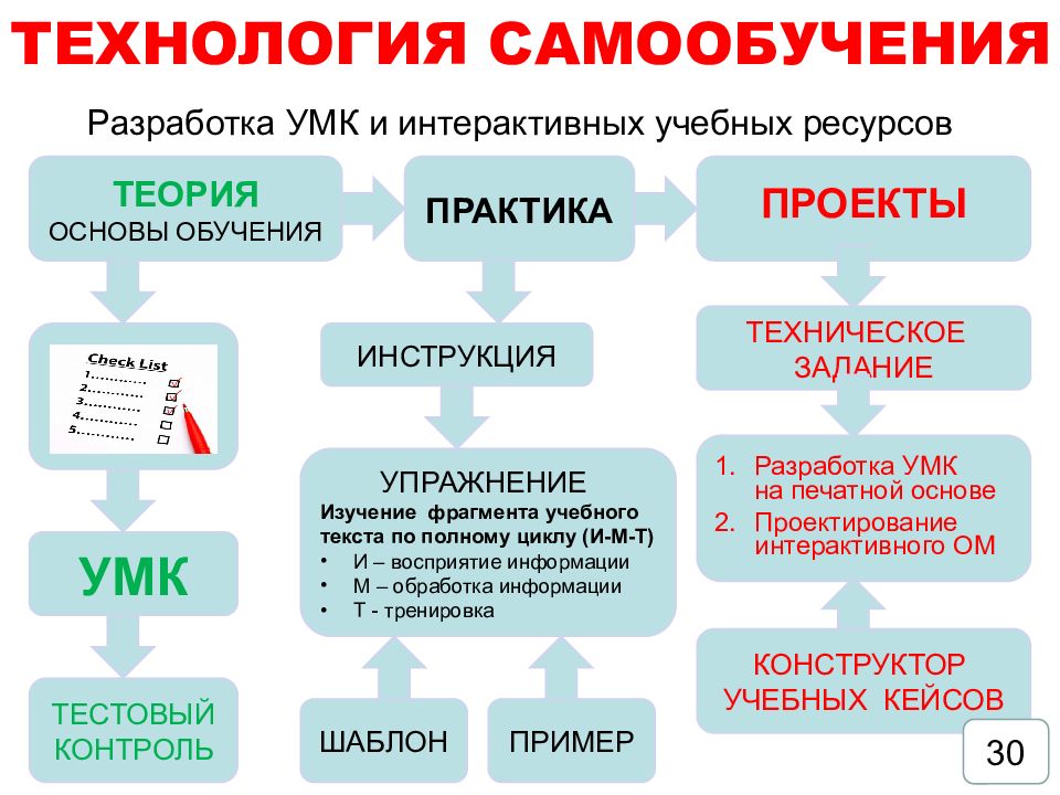 ТЕХНОЛОГИЯ САМООБУЧЕНИЯ Разработка УМК и интерактивных учебных ресурсов ТЕОРИЯ ОСНОВЫ ОБУЧЕНИЯ УМК ТЕСТОВЫЙ КОНТРОЛЬ ПРАКТИКА УПРАЖНЕНИЕ Изучение фрагмента учебного текста по полному циклу (И-М-Т) И – восприятие информации М – обработка информации Т - тренировка ИНСТРУКЦИЯ ШАБЛОН ПРИМЕР ПРОЕКТЫ ТЕХНИЧЕСКОЕ ЗАДАНИЕ Разработка УМК на печатной основе Проектирование интерактивного ОМ КОНСТРУКТОР УЧЕБНЫХ КЕЙСОВ 30