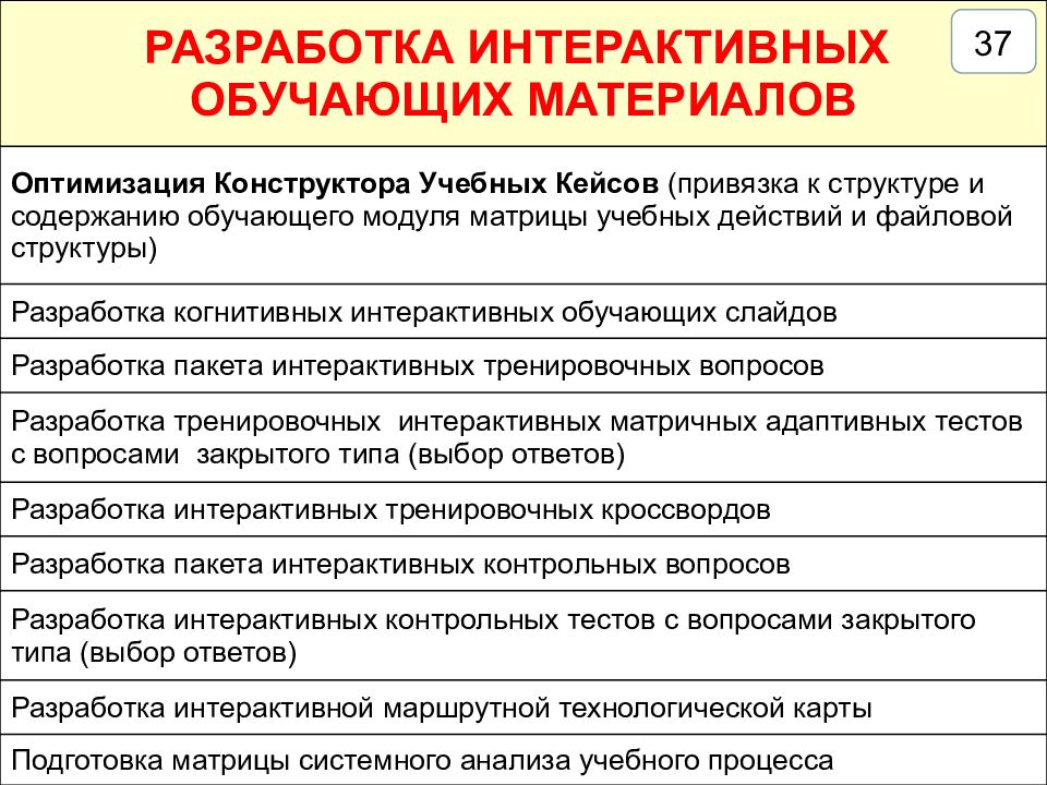 РАЗРАБОТКА ИНТЕРАКТИВНЫХ ОБУЧАЮЩИХ МАТЕРИАЛОВ Оптимизация Конструктора Учебных Кейсов (привязка к структуре и содержанию обучающего модуля матрицы учебных действий и файловой структуры) Разработка когнитивных интерактивных обучающих слайдов Разработка пакета интерактивных тренировочных вопросов Разработка тренировочных интерактивных матричных адаптивных тестов с вопросами закрытого типа (выбор ответов) Разработка интерактивных тренировочных кроссвордов Разработка пакета интерактивных контрольных вопросов Разработка интерактивных контрольных тестов с вопросами закрытого типа (выбор ответов) Разработка интерактивной маршрутной технологической карты Подготовка матрицы системного анализа учебного процесса 37