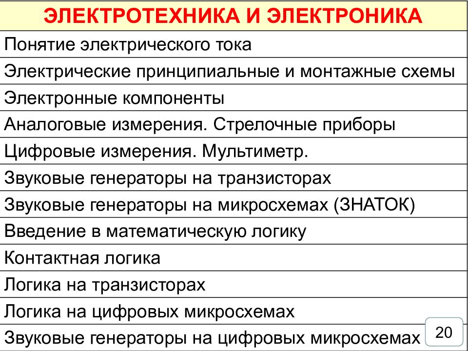 ЭЛЕКТРОТЕХНИКА И ЭЛЕКТРОНИКА Понятие электрического тока Электрические принципиальные и монтажные схемы Электронные компоненты Аналоговые измерения. Стрелочные приборы Цифровые измерения. Мультиметр. Звуковые генераторы на транзисторах Звуковые генераторы на микросхемах (ЗНАТОК) Введение в математическую логику Контактная логика Логика на транзисторах Логика на цифровых микросхемах Звуковые генераторы на цифровых микросхемах 20