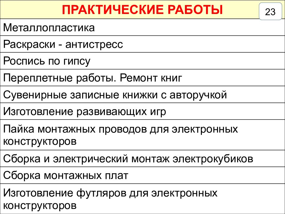 ПРАКТИЧЕСКИЕ РАБОТЫ Металлопластика Раскраски - антистресс Роспись по гипсу Переплетные работы. Ремонт книг Сувенирные записные книжки с авторучкой Изготовление развивающих игр Пайка монтажных проводов для электронных конструкторов Сборка и электрический монтаж электрокубиков Сборка монтажных плат Изготовление футляров для электронных конструкторов 23