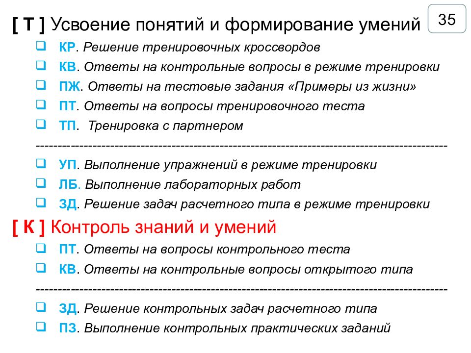 [ Т ] Усвоение понятий и формирование умений КР. Решение тренировочных кроссвордов КВ. Ответы на контрольные вопросы в режиме тренировки ПЖ. Ответы на тестовые задания «Примеры из жизни» ПТ. Ответы на вопросы тренировочного теста ТП. Тренировка с партнером ---------------------------------------------------------------------------------------------- УП. Выполнение упражнений в режиме тренировки ЛБ. Выполнение лабораторных работ ЗД. Решение задач расчетного типа в режиме тренировки [ К ] Контроль знаний и умений ПТ. Ответы на вопросы контрольного теста КВ. Ответы на контрольные вопросы открытого типа ---------------------------------------------------------------------------------------------- ЗД. Решение контрольных задач расчетного типа ПЗ. Выполнение контрольных практических заданий 35