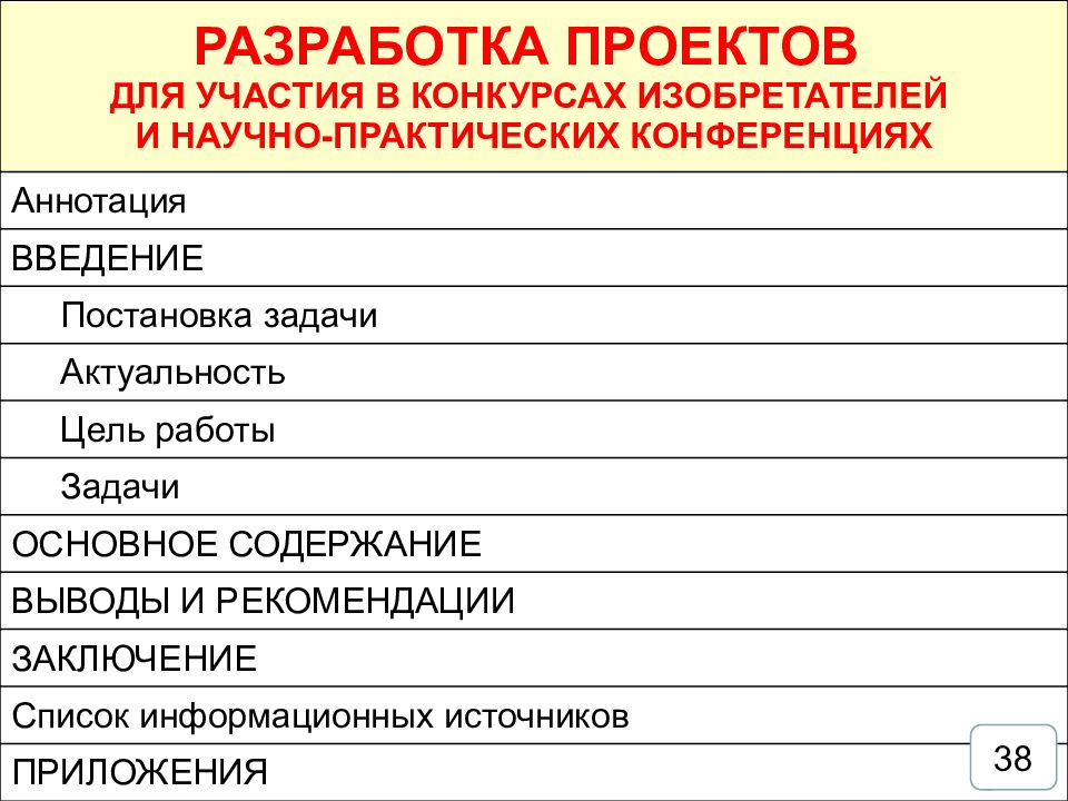 РАЗРАБОТКА ПРОЕКТОВ ДЛЯ УЧАСТИЯ В КОНКУРСАХ ИЗОБРЕТАТЕЛЕЙ И НАУЧНО-ПРАКТИЧЕСКИХ КОНФЕРЕНЦИЯХ Аннотация ВВЕДЕНИЕ Постановка задачи Актуальность Цель работы Задачи ОСНОВНОЕ СОДЕРЖАНИЕ ВЫВОДЫ И РЕКОМЕНДАЦИИ ЗАКЛЮЧЕНИЕ Список информационных источников ПРИЛОЖЕНИЯ 38