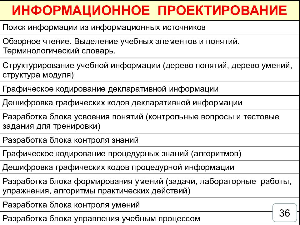 ИНФОРМАЦИОННОЕ ПРОЕКТИРОВАНИЕ Поиск информации из информационных источников Обзорное чтение. Выделение учебных элементов и понятий. Терминологический словарь. Структурирование учебной информации (дерево понятий, дерево умений, структура модуля) Графическое кодирование декларативной информации Дешифровка графических кодов декларативной информации Разработка блока усвоения понятий (контрольные вопросы и тестовые задания для тренировки) Разработка блока контроля знаний Графическое кодирование процедурных знаний (алгоритмов) Дешифровка графических кодов процедурной информации Разработка блока формирования умений (задачи, лабораторные работы, упражнения, алгоритмы практических действий) Разработка блока контроля умений Разработка блока управления учебным процессом 36