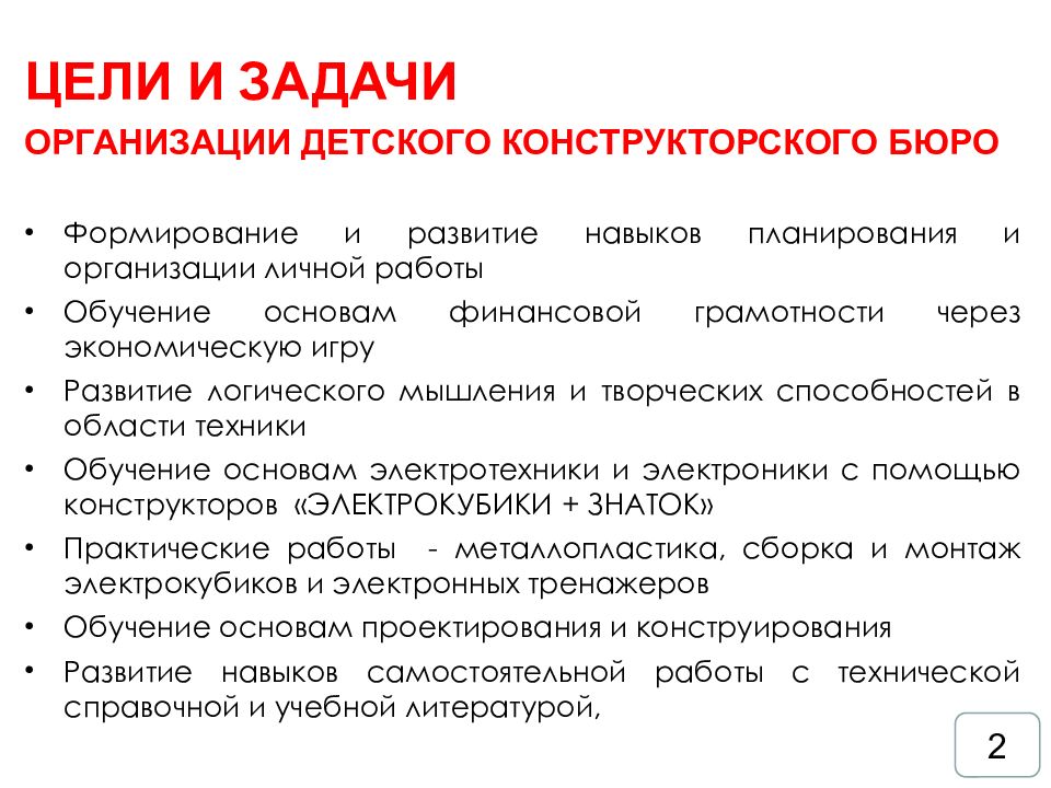 ЦЕЛИ И ЗАДАЧИ ОРГАНИЗАЦИИ ДЕТСКОГО КОНСТРУКТОРСКОГО БЮРО Формирование и развитие навыков планирования и организации личной работы Обучение основам финансовой грамотности через экономическую игру Развитие логического мышления и творческих способностей в области техники Обучение основам электротехники и электроники с помощью конструкторов «ЭЛЕКТРОКУБИКИ + ЗНАТОК» Практические работы - металлопластика, сборка и монтаж электрокубиков и электронных тренажеров Обучение основам проектирования и конструирования Развитие навыков самостоятельной работы с технической справочной и учебной литературой, 2