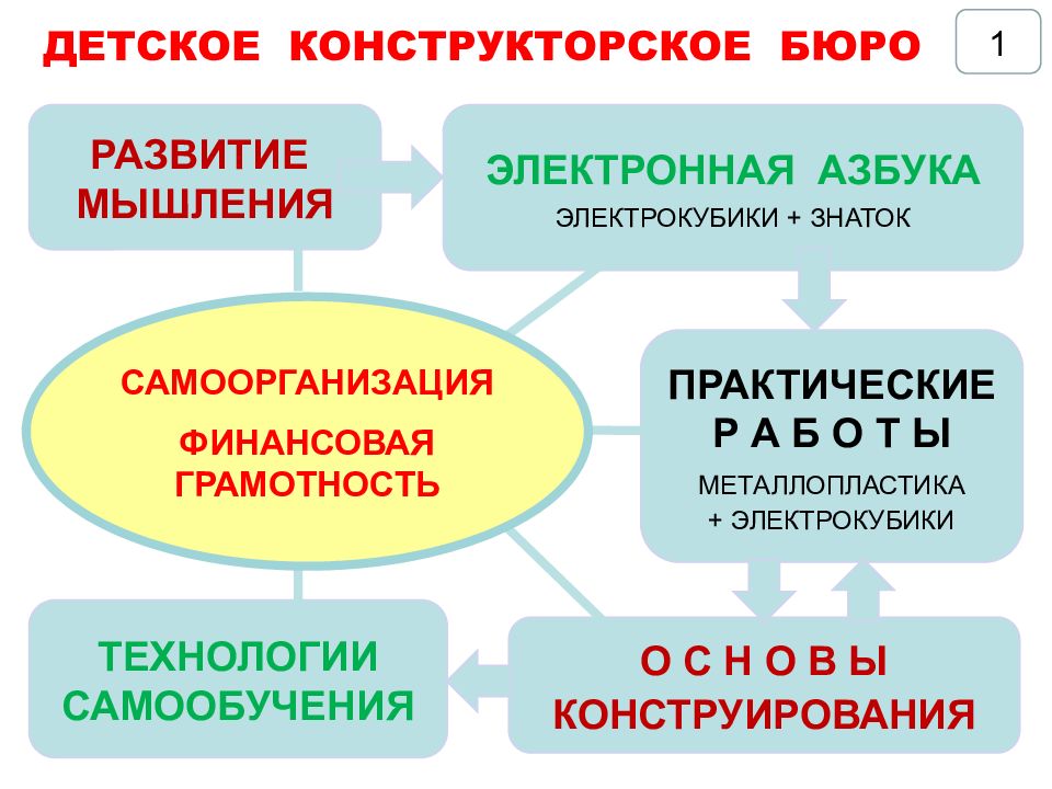 ДЕТСКОЕ КОНСТРУКТОРСКОЕ БЮРО РАЗВИТИЕ МЫШЛЕНИЯ ЭЛЕКТРОННАЯ АЗБУКА ЭЛЕКТРОКУБИКИ + ЗНАТОК ПРАКТИЧЕСКИЕ Р А Б О Т Ы МЕТАЛЛОПЛАСТИКА + ЭЛЕКТРОКУБИКИ О С Н О В Ы КОНСТРУИРОВАНИЯ ТЕХНОЛОГИИ САМООБУЧЕНИЯ САМООРГАНИЗАЦИЯ ФИНАНСОВАЯ ГРАМОТНОСТЬ 1