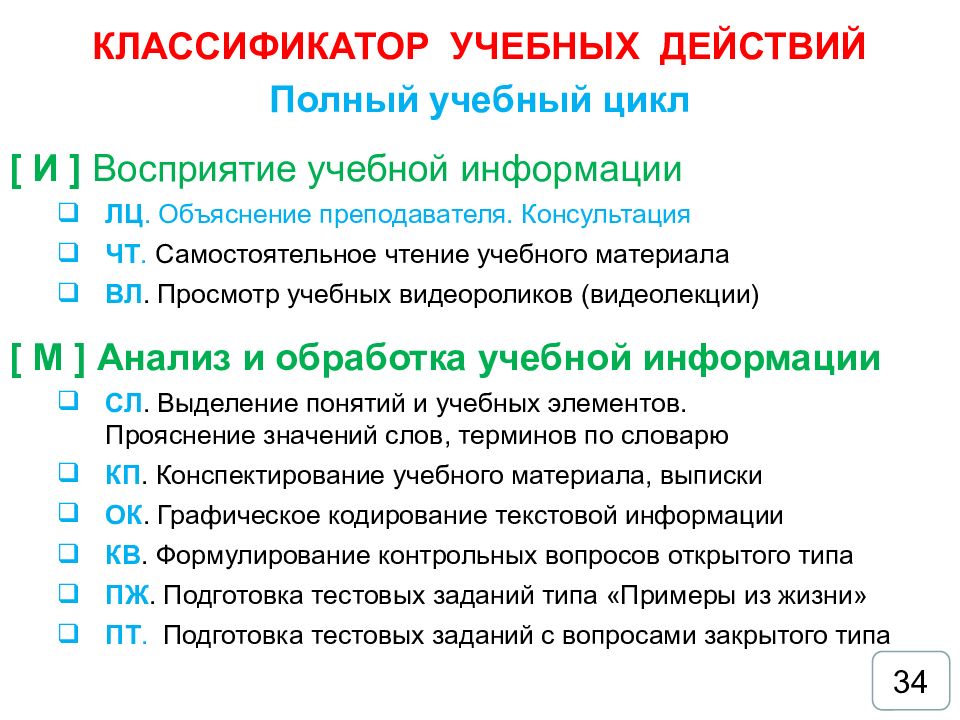 КЛАССИФИКАТОР УЧЕБНЫХ ДЕЙСТВИЙ Полный учебный цикл [ И ] Восприятие учебной информации ЛЦ. Объяснение преподавателя. Консультация ЧТ. Самостоятельное чтение учебного материала ВЛ. Просмотр учебных видеороликов ( видеолекции ) [ М ] Анализ и обработка учебной информации СЛ. Выделение понятий и учебных элементов. Прояснение значений слов, терминов по словарю КП. Конспектирование учебного материала, выписки ОК. Графическое кодирование текстовой информации КВ. Формулирование контрольных вопросов открытого типа ПЖ. Подготовка тестовых заданий типа «Примеры из жизни» ПТ. Подготовка тестовых заданий с вопросами закрытого типа 34