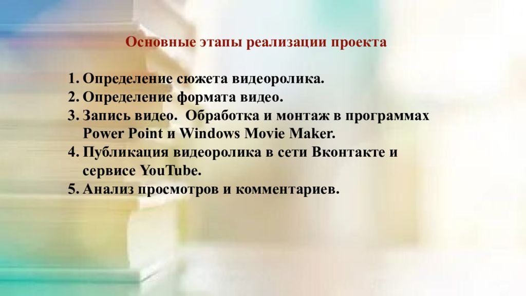 Основные этапы реализации проекта Определение сюжета видеоролика. Определение формата видео. Запись видео. Обработка и монтаж в программах Power Point и Windows Movie Maker. Публикация видеоролика в сети Вконтакте и сервисе YouTube. Анализ просмотров и комментариев.