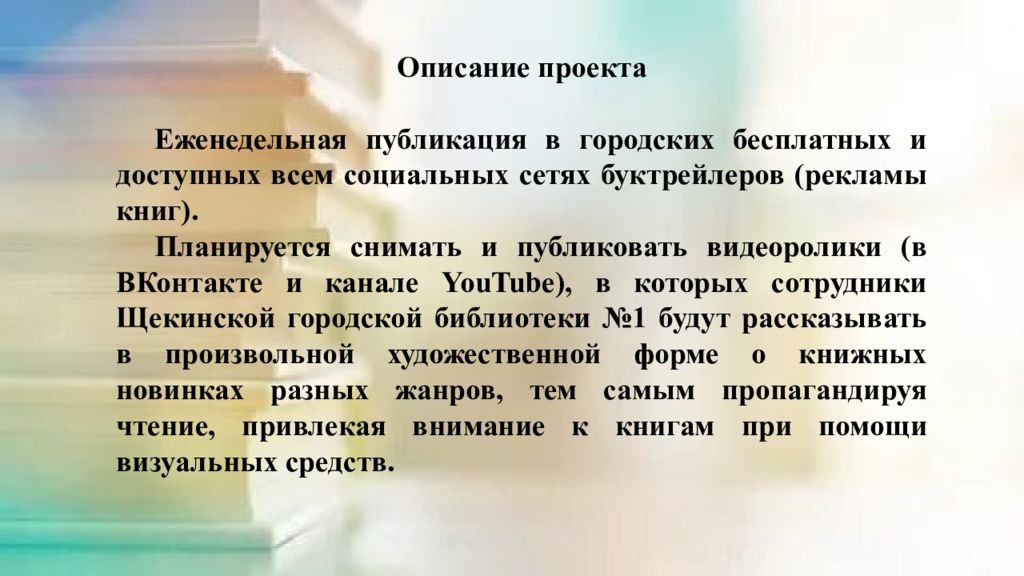 Описание проекта Еженедельная публикация в городских бесплатных и доступных всем социальных сетях буктрейлеров (рекламы книг). Планируется снимать и публиковать видеоролики (в ВКонтакте и канале YouTube ), в которых сотрудники Щекинской городской библиотеки № 1 будут рассказывать в произвольной художественной форме о книжных новинках разных жанров, тем самым пропагандируя чтение, привлекая внимание к книгам при помощи визуальных средств.