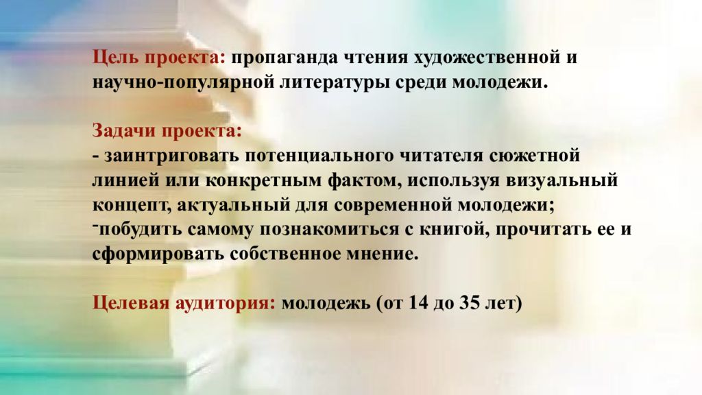 Цель проекта: пропаганда чтения художественной и научно-популярной литературы среди молодежи. Задачи проекта: - заинтриговать потенциального читателя сюжетной линией или конкретным фактом, используя визуальный концепт, актуальный для современной молодежи; побудить самому познакомиться с книгой, прочитать ее и сформировать собственное мнение. Целевая аудитория: молодежь (от 14 до 35 лет)