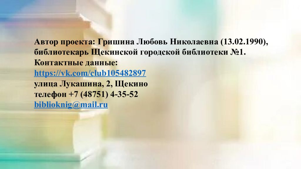 Автор проекта: Гришина Любовь Николаевна (13.02.1990), библиотекарь Щекинской городской библиотеки №1. Контактные данные: https://vk.com/club105482897 улица Лукашина, 2, Щекино телефон +7 (48751) 4-35-52 biblioknig@mail.ru