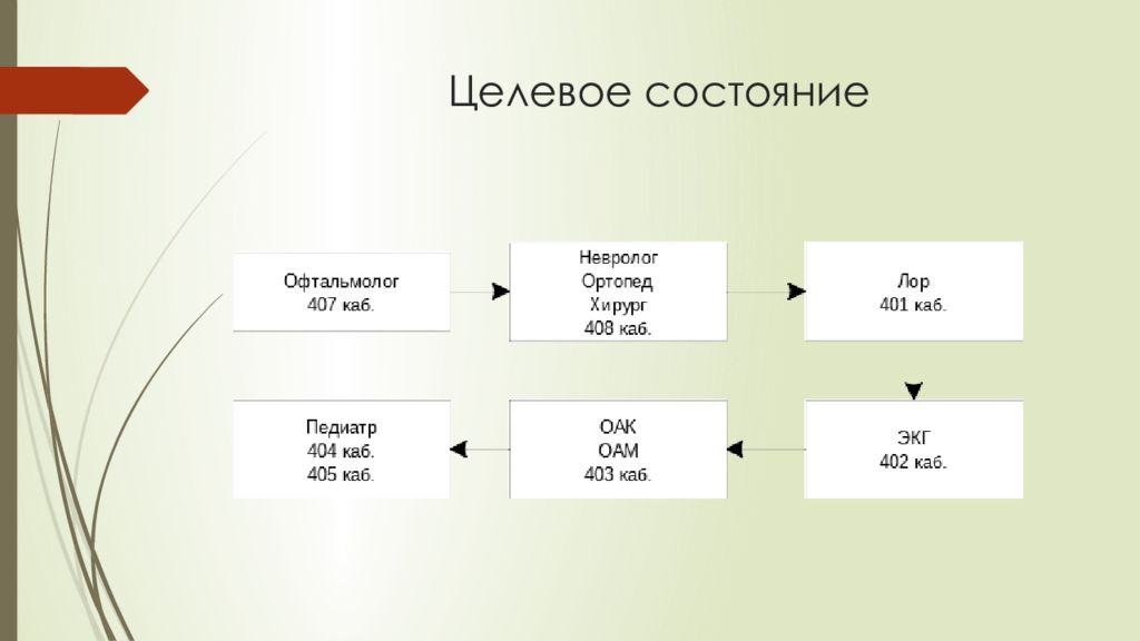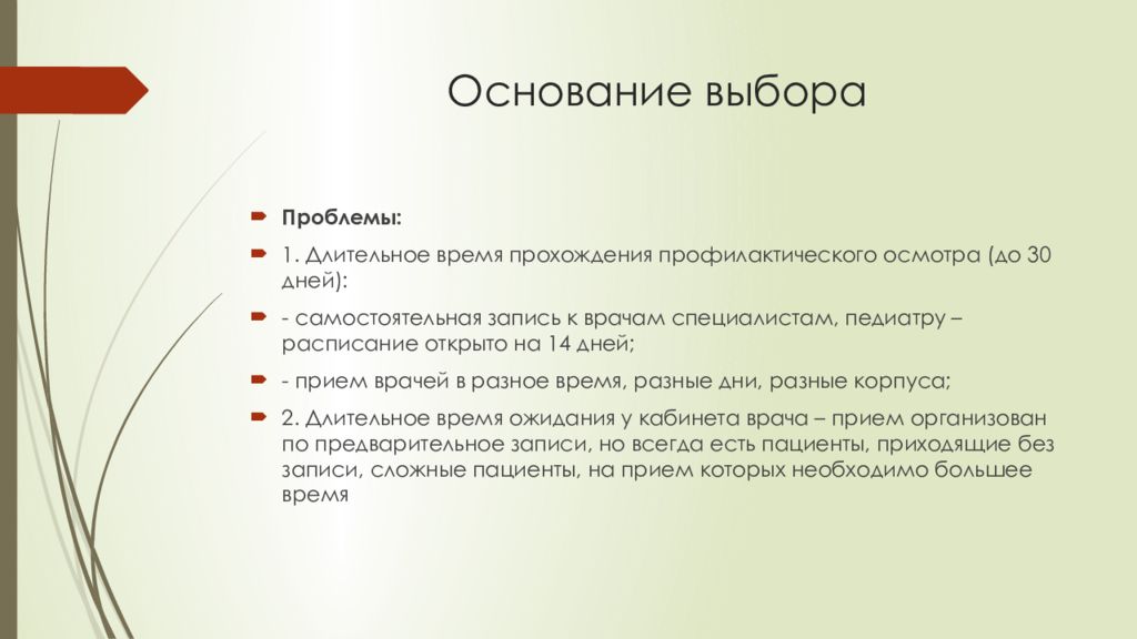 Проблемы: 1. Длительное время прохождения профилактического осмотра (до 30 дней): - самостоятельная запись к врачам специалистам, педиатру – расписание открыто на 14 дней; - прием врачей в разное время, разные дни, разные корпуса; 2. Д лительное время ожидания у кабинета врача – прием организован по предварительное записи, но всегда есть пациенты, приходящие без записи, сложные пациенты, на прием которых необходимо большее время