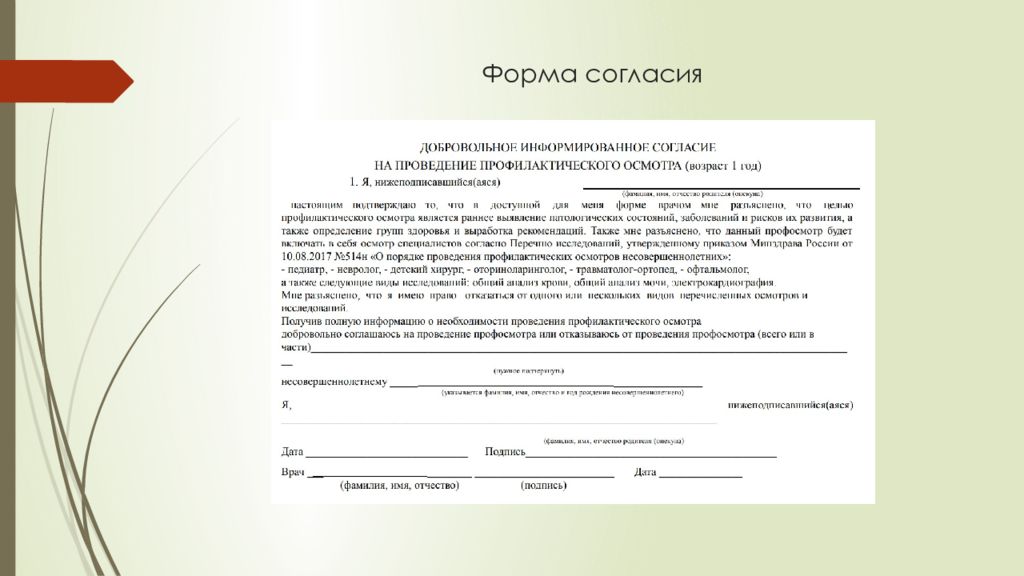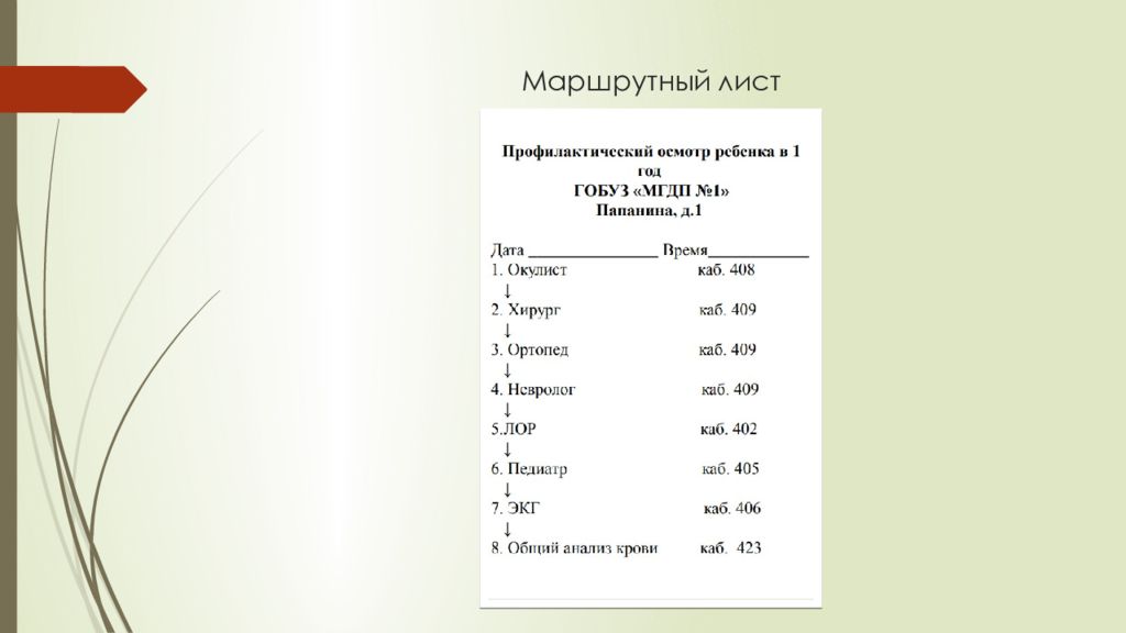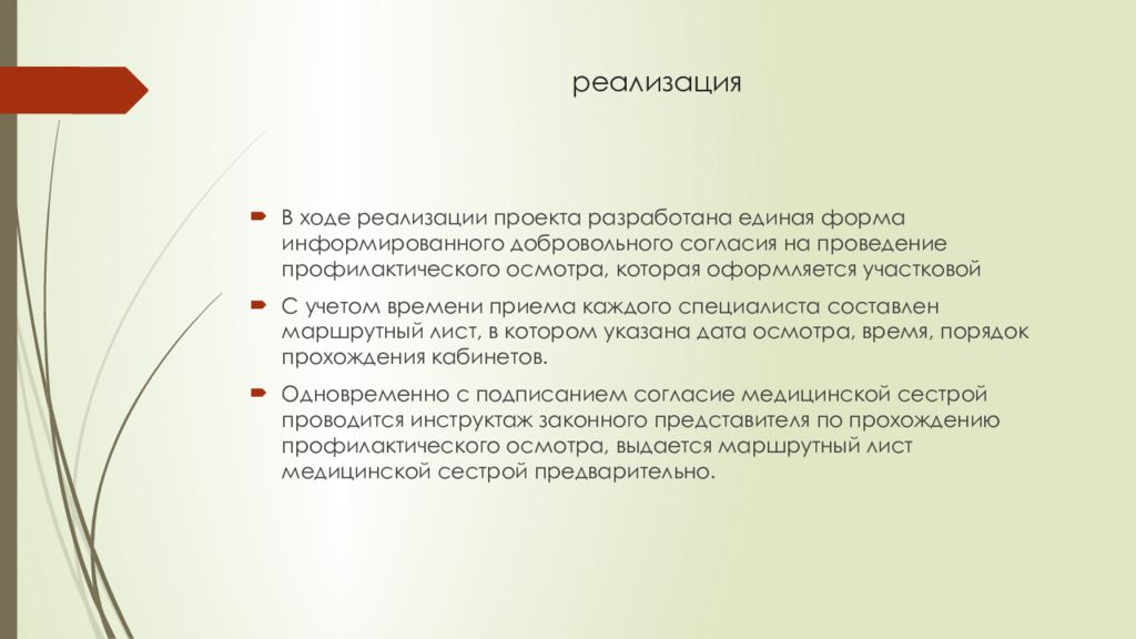 В ходе реализации проекта разработана единая форма информированного добровольного согласия на проведение профилактического осмотра, которая оформляется участковой С учетом времени приема каждого специалиста составлен маршрутный лист, в котором указана дата осмотра, время, порядок прохождения кабинетов. Одновременно с подписанием согласие медицинской сестрой проводится инструктаж законного представителя по прохождению профилактического осмотра, выдается маршрутный лист медицинской сестрой предварительно.