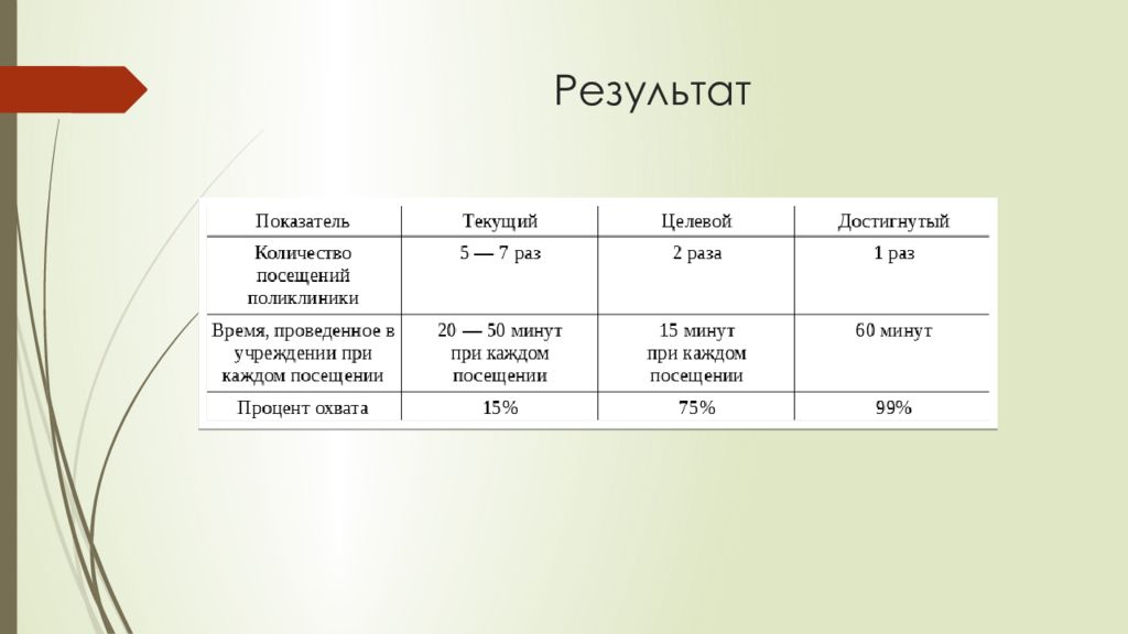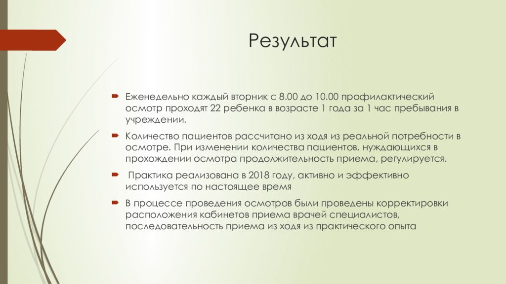 Еженедельно каждый вторник с 8.00 до 10.00 профилактический осмотр проходят 22 ребенка в возрасте 1 года за 1 час пребывания в учреждении. Количество пациентов рассчитано из ходя из реальной потребности в осмотре. При изменении количества пациентов, нуждающихся в прохождении осмотра продолжительность приема, регулируется. Практика реализована в 2018 году, активно и эффективно используется по настоящее время В процессе проведения осмотров были проведены корректировки расположения кабинетов приема врачей специалистов, последовательность приема из ходя из практического опыта