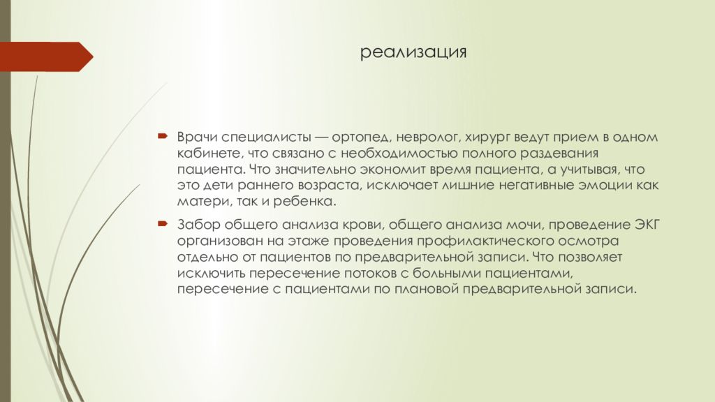 Врачи специалисты — ортопед, невролог, хирург ведут прием в одном кабинете, что связано с необходимостью полного раздевания пациента. Что значительно экономит время пациента, а учитывая, что это дети раннего возраста, исключает лишние негативные эмоции как матери, так и ребенка. Забор общего анализа крови, общего анализа мочи, проведение ЭКГ организован на этаже проведения профилактического осмотра отдельно от пациентов по предварительной записи. Что позволяет исключить пересечение потоков с больными пациентами, пересечение с пациентами по плановой предварительной записи.