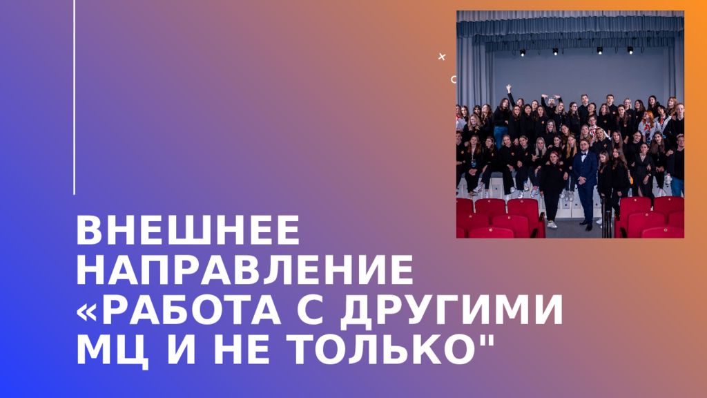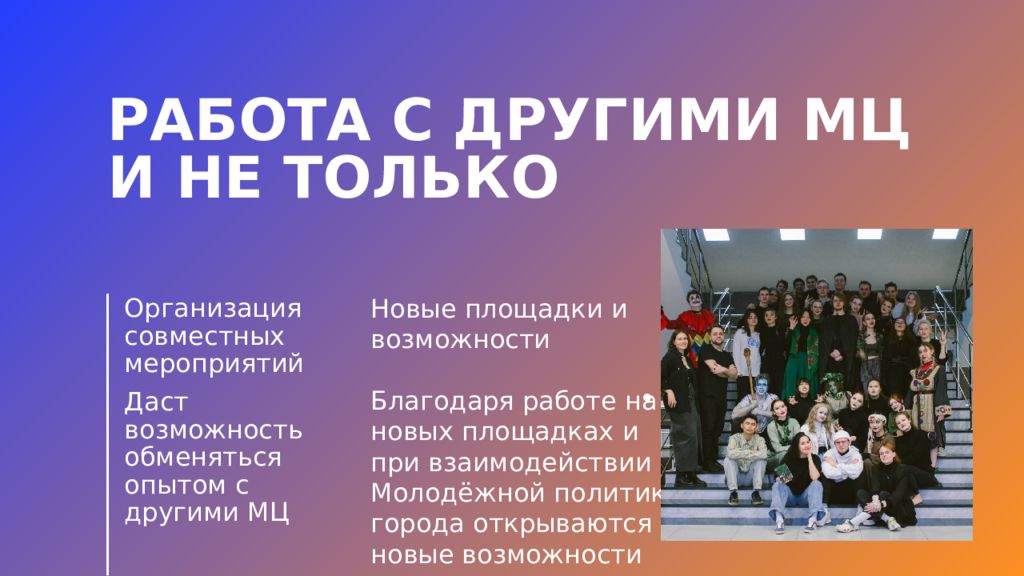 Организация совместных мероприятий Даст возможность обменяться опытом с другими МЦ Новые площадки и возможности Благодаря работе на новых площадках и при взаимодействии с Молодёжной политики города открываются новые возможности