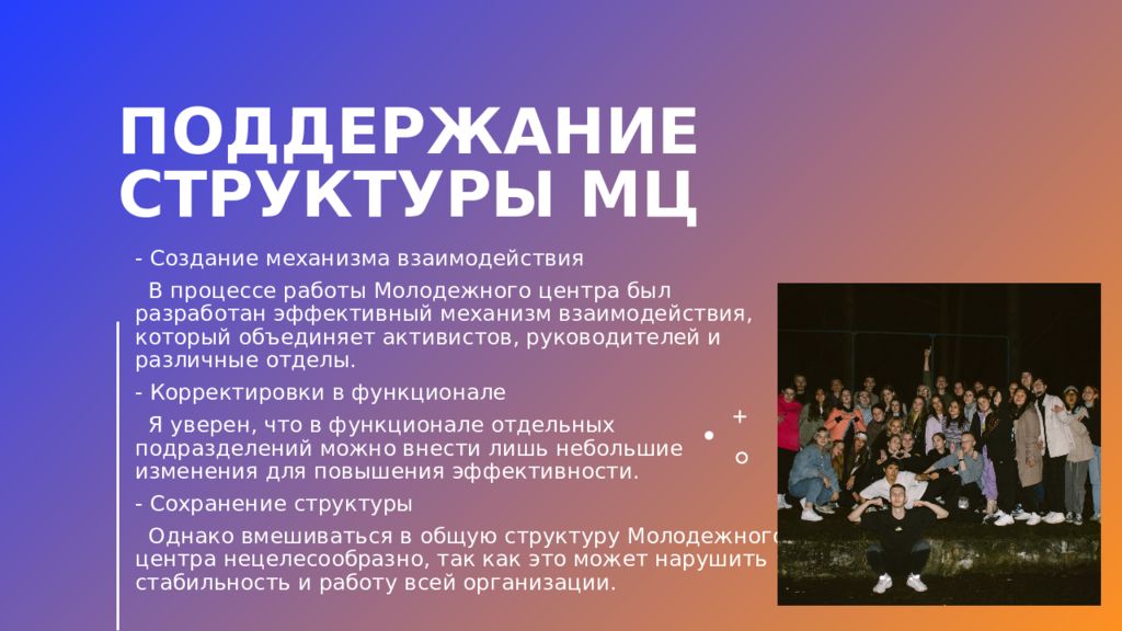 - Создание механизма взаимодействия В процессе работы Молодежного центра был разработан эффективный механизм взаимодействия, который объединяет активистов, руководителей и различные отделы. - Корректировки в функционале Я уверен, что в функционале отдельных подразделений можно внести лишь небольшие изменения для повышения эффективности. - Сохранение структуры Однако вмешиваться в общую структуру Молодежного центра нецелесообразно, так как это может нарушить стабильность и работу всей организации.