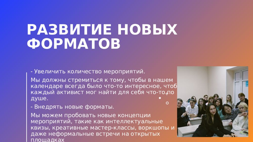 Увеличить количество мероприятий. Мы должны стремиться к тому, чтобы в нашем календаре всегда было что-то интересное, чтобы каждый активист мог найти для себя что-то по душе. Внедрять новые форматы. Мы можем пробовать новые концепции мероприятий, такие как интеллектуальные квизы, креативные мастер-классы, воркшопы и даже неформальные встречи на открытых площадках