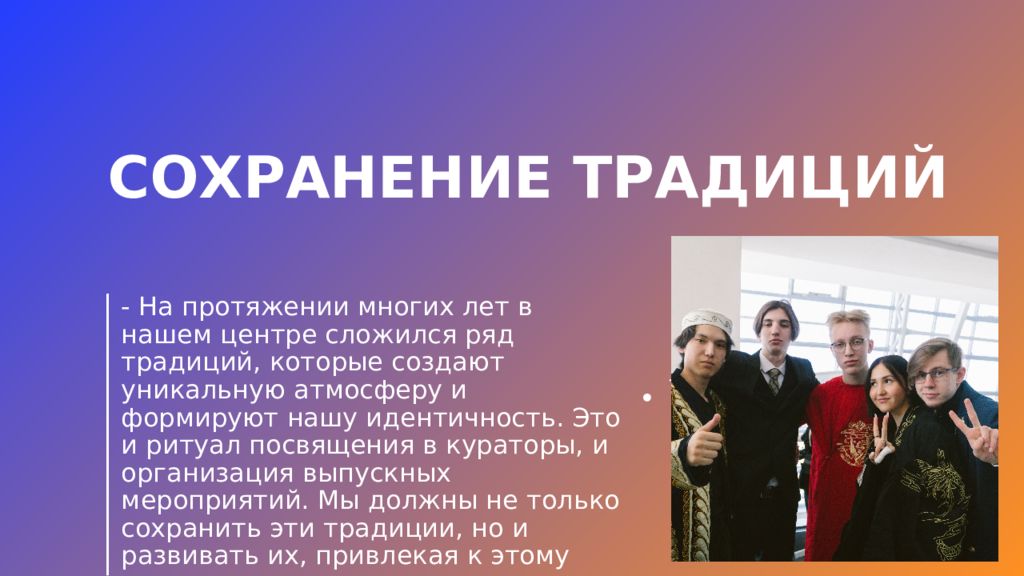 - На протяжении многих лет в нашем центре сложился ряд традиций, которые создают уникальную атмосферу и формируют нашу идентичность. Это и ритуал посвящения в кураторы, и организация выпускных мероприятий. Мы должны не только сохранить эти традиции, но и развивать их, привлекая к этому процессу всех участников центра.