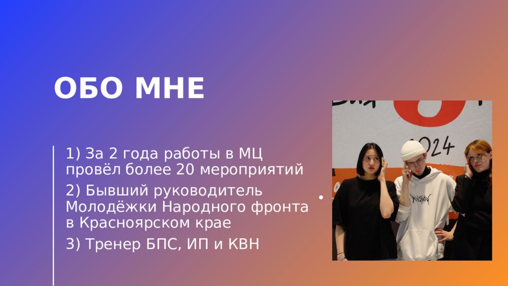 1) За 2 года работы в МЦ провёл более 20 мероприятий 2) Бывший руководитель Молодёжки Народного фронта в Красноярском крае 3) Тренер БПС, ИП и КВН