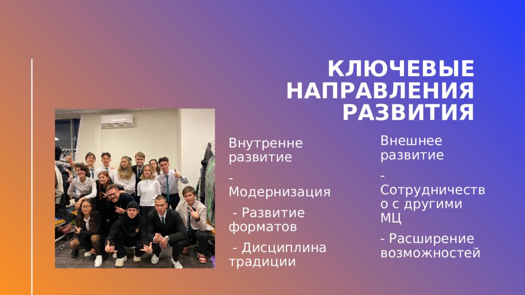 Внутренне развитие - Модернизация - Развитие форматов - Дисциплина традиции Внешнее развитие - Сотрудничество с другими МЦ - Расширение возможностей