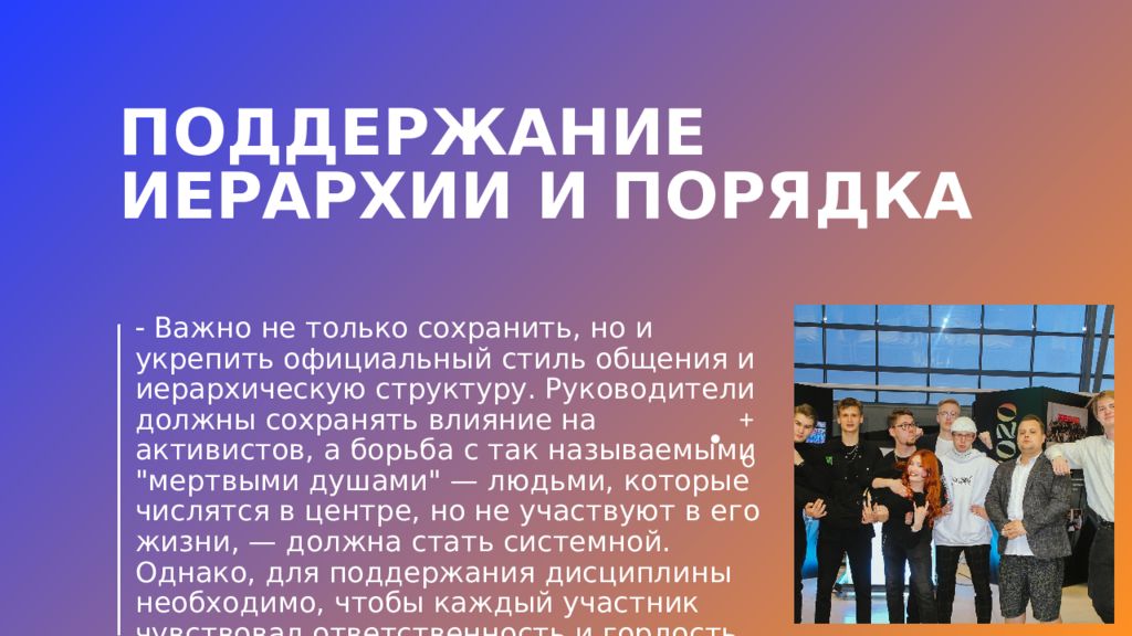 Важно не только сохранить, но и укрепить официальный стиль общения и иерархическую структуру. Руководители должны сохранять влияние на активистов, а борьба с так называемыми "мертвыми душами" — людьми, которые числятся в центре, но не участвуют в его жизни, — должна стать системной. Однако, для поддержания дисциплины необходимо, чтобы каждый участник чувствовал ответственность и гордость за свою работу.
