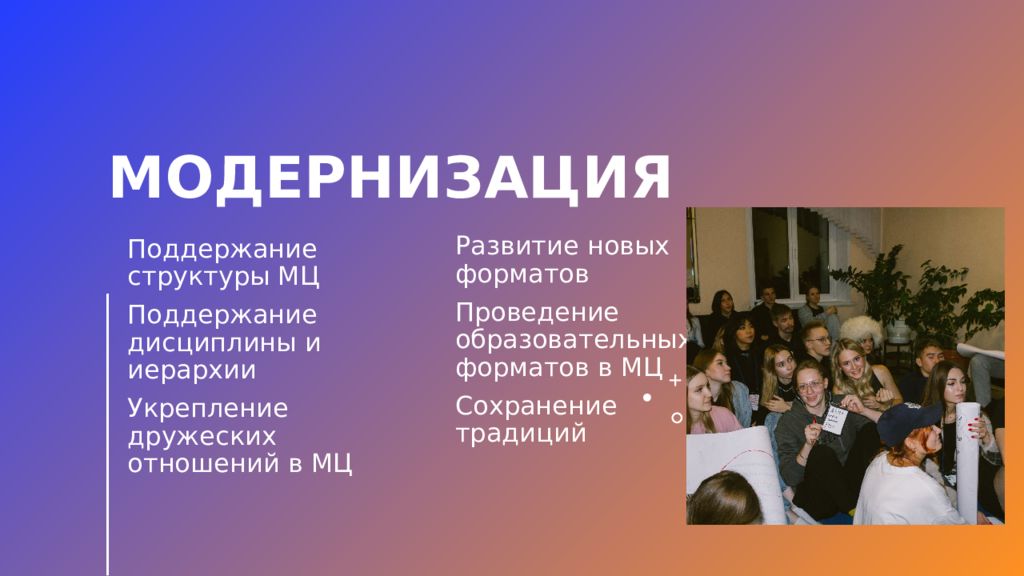 Поддержание структуры МЦ Поддержание дисциплины и иерархии Укрепление дружеских отношений в МЦ Развитие новых форматов Проведение образовательных форматов в МЦ Сохранение традиций