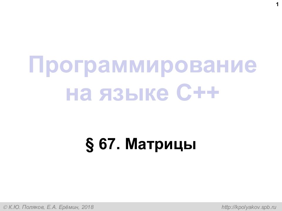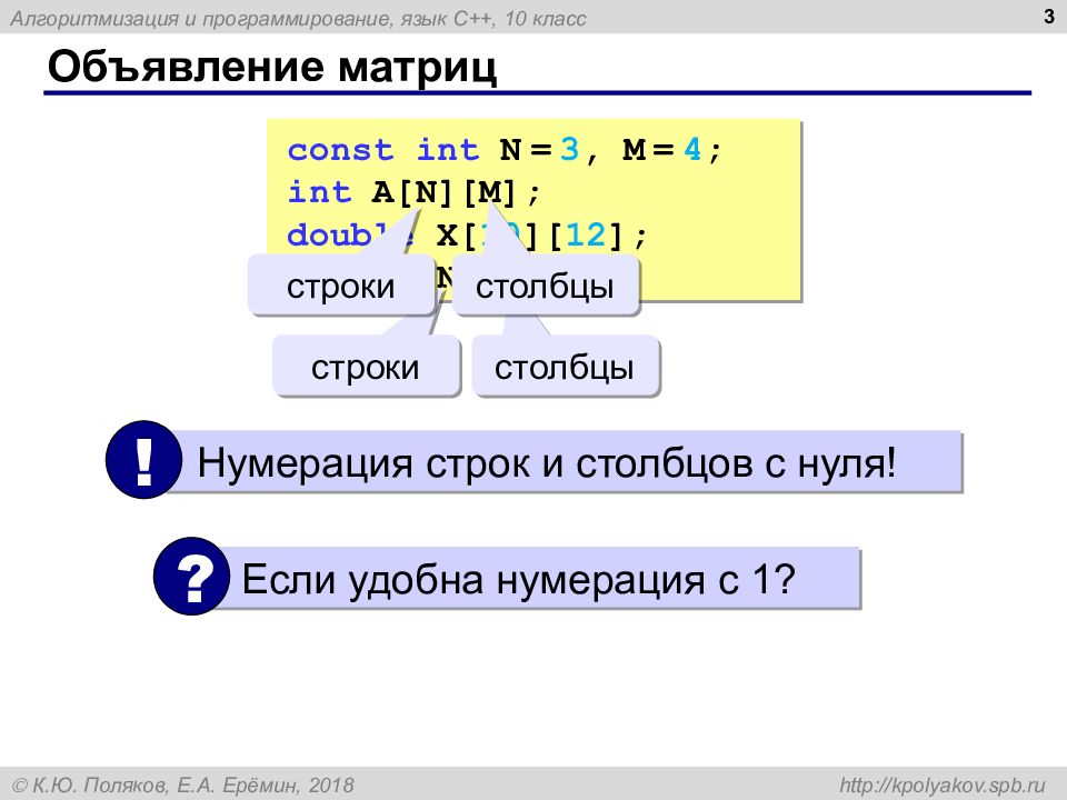 3 const int N = 3, M = 4 ; int A[N][M]; double X[ 10 ][ 12 ]; bool L[N][ 2 ]; строки столбцы строки столбцы Если удобна нумерация с 1? ? Нумерация строк и столбцов с нуля! !